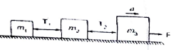 Question 26. As shown in the figure, three blocks connected together lie on a horizontal frictionless table and are pulled to the right with a force F = 50 N. If m₁ = 5 kg, m₂ = 10 kg and m₃ = 15 kg, find the tensions T₁ and T₂.